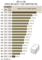 고령화 추세 속에 복지지출이 나날이 확대됨에 따라 오는 2040년에는 생산가능인구 1인당 사회복지비용 부담이 최대 491만원에 이를 것이라는 전망이 제시됐다. 한국경제연구원(한경연)은 14일 '인구 감소와 경제시스템 위기 보고서'에서 "2040년까지 생산가능인구가 21.9% 감소함에 따라 생산가능인구 1인이 부담해야 할 사회복지비용 규모가 광역시도별로 최대 50.1%까지 증가하게 될 것"이라고 밝혔다.보고서에 따르면 2040년 생산가능인구 1인이 부담해야 할 사회복지비용이 최소 164만원에서 최대 491만원 수준으로 나타났다. 2016년을 기준으로 생산가능인구 1인당 사회복지비용 부담은 최소 137만원에서 최대 366만원이다. 24년 후인 2040년까지 연평균 0.5~1.7% 증가해 2016년 대비 13.7~50.1% 수준으로 늘어날 것으로 전망된다. 16개 광역시도별 2040년 생산가능인구 1인당 사회복지비 부담 규모는 전남지역이 491만원으로 가장 높았다. 이어 ▲전북 410만원 ▲경북 372만원 ▲강원 341만원 ▲부산 329만원 ▲대구 302만원 등의 순이었다. 2016년부터 2040년까지 1인당 사회복지비 부담 증가율은 부산지역이 50.06%로 가장