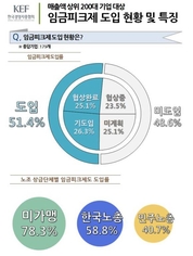 매출액 상위 200대 기업들의 임금피크제 도입률이 50%를 넘어선 것으로 조사됐다.한국경영자총협회(회장 박병원)가 8일 공공기관을 제외한 매출액 상위 200대 기업(응답기업 179개사)을 대상으로 '임금피크제 도입 현황 및 특징조사'를 한 결과 임금피크제 도입을 완료한 기업은 51.4%로 집계됐다.응답 기업의 23.5%는 임금피크제 도입을 위한 협상을 진행하고 있고, 나머지 25.1%는 제도 도입을 위한 논의가 이뤄지지 않은 것으로 나타났다. 임금피크제 도입을 완료한 기업 중 47.8%가 내년부터 제도를 시행하는 것으로 조사됐다. 이미 임금피크제를 도입한 경우 주로 2014년(21.7%)과 2015년(21.7%)에 시행하는 것으로 드러났다. 지난 2013년 이전에 도입한 기업은 7.7%였다.자동호봉승급제를 운영중인 기업이 임금피크제 도입 비율(55.3%)이 자동호봉승급제가 없는 기업의 도입 비율(40.5%)보다 높았다. 경총은 "임금피크제를 도입하게 된 주요 이유가 자동호봉승급제로 인한 부담이라는 것을 보여준다"라고 분석했다.응답기업 중 노조가 있는 기업의 임금피크제 도입률은 55.1%, 무노조 기업의 임금피크제 도입률은 39.1%였다. 경총은 "자동호봉승급