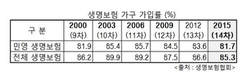 국내 생명보험 가입률이 2003년 이후 12년째 하향세를 그렸다. 반면에 생명보험 가입 의향은 크게 상승한 것으로 나타났다.9일 생명보험협회(회장 이수창)가 지난 8월23일부터 10월6일까지 전국 2000가구를 대상으로 실시한 '제14차 생명보험 성향조사'에 따르면 전체 생명보험 가구가입률은 85.3%로 2012년(86.6%)보다 1.3%포인트 하락했다.생명보험 성향조사는 생명보험협회가 1976년부터 매 3년마다 실시하는 업계 유일의 국가승인통계다.생명보험 가입률은 2000년 86.2%, 2003년 89.9%로 정점을 기록한 뒤 2006년 89.2%, 2009년 87.5%, 2012년 86.6%로 하락세가 이어졌다.우체국보험과 축·수협 생명공제를 제외한 민영생명보험 가입률도 비슷한 추세를 보였다.민영생명보험 가입률은 2000년 81.9%, 2003년 85.4%, 2006년 85.7%로 상승세를 보인 뒤 2009년 84.5%, 2012년 83.6% , 2015년 81.7%로 하락세를 기록했다.이번 조사에서 가구당 평균 민영생명보험 가입건수는 3.7건, 연간 평균 납입보험료는 437만원(월 36만4000원)에 달했다. 2012년 대비 0.6건, 53만원(월 4.