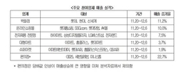 한국판 블랙프라이데이인 'K-Sale Day'(케이-세일 데이)에 참여한 유통업체들이 매출 증가 효과를 톡톡히 누렸다.9일 유통산업연합회가 K-Sale Day 참여 유통기업 매출실적을 분석한 결과에 따르면 K-Sale Day가 시작된 지난 11월20일부터 지난 6일까지 백화점, 대형마트, 슈퍼마켓, 편의점, 온라인쇼핑몰, 전자제품전문점 등 전 업종에서 매출이 전년 동기 대비 증가한 것으로 나타났다.가장 크게 증가한 업종은 백화점이었다. 롯데, 현대, 신세계 백화점의 지난 17일간 매출이 전년 동기 대비 평균 11.2% 증가했다.국내 백화점업계가 중국 광군절과 미국 블랙프라이데이, 사이버먼데이 등 국제적 쇼핑행사에 대응하기 위해 프로모션을 공격적으로 진행한 것이 주효한 것으로 보인다.실제로 현대백화점은 코엑스에서 450억원 규모의 물량을 대방출한 '푸드리빙페어'(11월18~22일)를 실시해 소비자들의 큰 호응을 얻었다. 롯데백화점은 지난 코리아 블랙프라이데이(10월1~15일) 행사 때 일산 킨텍스에서 출장세일을 성공적으로 개최한 데 이어 12월 중순에 유사한 세일대전을 다시 한 번 진행할 계획이다.롯데홈쇼핑, SSG.com, 롯데닷컴, AK몰 등 온라인쇼핑몰은
