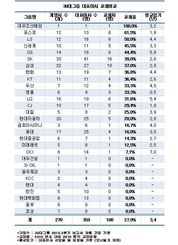 지난 1년 새 30대 그룹의 대표이사 70% 이상이 유임되고 퇴임자도 3년 이상 임기를 채우는 등 인사 변동폭이 매우 적은 것으로 조사됐다. 전체 3분의 1인 9개 그룹은 대표이사를 단 한 명도 교체하지 않았다. 경영 환경이 어려워지면서 대기업들이 안정 경영을 지향했다는 분석이다.17일 기업 경영성과 평가사이트 CEO스코어(대표 박주근)가 국내 30대 그룹 270개 계열사 359명의 대표이사를 대상으로 2015~2016년 이사 선임 안건을 분석한 결과, 100명(27.9%)이 교체됐다. 퇴임한 이들의 임기는 3.4년으로 집계됐다. 상법상 대표이사 임기가 2~3년인 점을 고려하면 기본 임기 이상을 채운 셈이다. 퇴임자들의 평균 나이는 58.9세, 신규 선임된 대표이사 나이는 56.9세였다. 이 조사에서 사업보고서를 제출하지 않은 부영은 뺐다.그룹별로는 대표이사가 1명인 대우조선해양을 제외하면 포스코와 LS 그룹 등이 대표이사 절반 이상을 바꿔 교체율이 높았다.포스코그룹은 지난 1년 간 대표이사 61.5%를 교체, 변동폭이 가장 컸다. 12개 계열사 대표이사 13명 중 대우인터내셔널, 포스코에너지, 포스코엔지니어링, 포스코플랜텍, 포스코엠텍, 포스코켐텍, 포스코