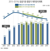 정부는 16일 발표한 '2015~2019년 공공기관 중장기계획'에서 지난해보다 더욱 강도 높은 부채 감축 목표를 세웠다.정부는 지난해 발표했던 2014~2018 계획에서 2018년 39개 공공기관 부채를 512조8000억원 수준으로 관리하고, 지난해 216% 수준인 자기자본 대비 부채 비율은 174%까지 낮춘다는 목표를 세웠다.올해 계획에서는 감축 목표가 더욱 강화됐다. 부채 규모는 2018년 508조2000억원으로 줄어든다. 부채 비율은 2018년 170%, 2019년에는 163%까지 떨어진다.부채 비율이 높은 18개 중점관리기관도 부채 비율이 2014년 322%에서 2019년 226%로 낮아지는 등 재무 구조가 대폭 개선될 전망이다.한국철도공사(코레일)는 자산 매각(공항철도, 역세권 부지) 등을 통해 부채 비율이 2015년 324%에서 185%까지 낮아진다.한국토지주택공사(LH)는 행복주택 등 임대사업 확대로 부채 규모는 2000억원 가량 늘지만 부채 비율은 388%에서 332%로 떨어진다.에너지 공기업 들의 재무 건전성도 높아질 전망이다.한국가스공사는 신규 투자를 억제하고 호주 LNG등 해외사업 생산이 본격화되면서 부채 비율이 2015년 334%에서 2