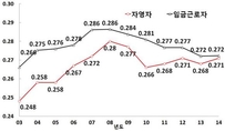 자영업자 가구의 소득불균등 현상이 지난 2010년을 기점으로 갈수록 심화하고 있다는 연구결과가 나왔다.한국경제연구원은 11일 2003년부터 2014년까지 통계청 가계동향조사 자료를 바탕으로 작성된 '자영자 가구의 소득불균등 추이와 시사점' 보고서를 통해 이같이 밝혔다.한경연에 따르면 최근 5년간 임금근로자의 소득불균등은 개선된 데 반해 자영업자의 소득불균등은 심화됐다. 지난 2010년 자영업자의 지니계수는 0.266으로 임금근로자 0.281과 0.015포인트 차이를 보였다.하지만 2010년을 기점으로 자영업자 지니계수가 꾸준히 높아져 지난해 0.271 수준까지 상승했다. 반면 임금근로자는 지니계수가 2008년 이후 점차 낮아져 2014년 0.272로 나타났다.한경연은 자영업자 가구의 소득불균등 심화 원인으로 가구주 외 가구원의 경제활동 부진을 꼽았다. 기타 가구원과 배우자가 벌어들이는 소득인 부(副)소득원천이 감소하면서 소득불균등이 심화했다는 분석이다.실제로 지난해 부소득원천이 0인 자영자 가구의 비율이 51%로 2012년의 46%보다 약 5%포인트 상승하는 등 해당 가구의 비율이 최근 높아지면서 소득불균등이 심화하는 상황이다.임금근로자 가구의 비율은 201