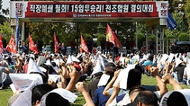 22일째 전면 파업을 벌이고 있는 금호타이어 노조가 7일 회사 측의 직장 폐쇄를 규탄하는 조합원 결의대회를 열고 "성실한 자세로 교섭에 나설 것"을 촉구했다.금호타이어 노조는 이날 오전 광주공장 운동장에서 조합원 2500여명(주최 측 추산)이 참여한 결의대회를 열고 "사측은 직장폐쇄를 철회하고 성실한 자세로 교섭에 나서야 한다"고 밝혔다.노조는 사측이 전남지방노동위원회에 일방적인 중재를 신청해 노조의 파업을 불법으로 몰아가려 했다고 주장했다.또 중재신청이 거부되자 여론을 반전시키고 노조 간 갈등을 부추기기 위한 조치로 직장폐쇄를 단행했다고 강조했다.노조는 사측이 임금피크제를 올해 도입하는 조건으로 구체적인 사항을 명문화하고 일시금 300만원을 주겠다고 제안했으나 이를 받아들일 수 없으며 내년 임단협에서 임금피크제를 합의·시행할 것을 요구했다.노조는 또 "결단력 없는 사측 교섭 위원들은 눈치만 보며 진전된 안을 제시하지 못했으며, 최고 결정권자인 박삼구 회장은 금호산업 인수 매각자금 확보에만 눈이 멀어 교섭을 방치하고 있다"고 비판했다.이어 "사측은 노조와 진정성 있는 교섭으로 상황을 풀어가야 하지만 직장폐쇄 뒤에는 교섭에 나서지 않겠다는 무책임한 모습을 보이