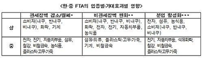 국내 기업이 가장 다양한 방법으로 한·중 FTA 효과를 활용할 수 있는 분야는 소비재, 업종별로는 화학, 전자, 농식품 등 분야인 것으로 나타났다. 코트라(KOTRA·사장 김재홍)는 한·중 FTA 서명을 맞아 21일 발표한 '한·중 FTA 업종별 효과와 활용 방향' 보고서에서 이같이 밝혔다.한·중 FTA 기대효과는 ▲관세철폐에 따른 가격경쟁력 향상 ▲비관세장벽 완화에 따른 시장진출 여건 개선 ▲국제 분업 활성화에 따른 상생발전 등으로 기대된다.코트라에 따르면 관세철폐 효과에서 화학(일반 및 정밀화학)과 기계가, 비관세장벽 완화 효과에서는 화학, 전기·전자, 자동차부품, 농식품 등이 가장 큰 수혜를 볼 것으로 조사됐다. 한·중 양국 간 국제분업 개선효과가 두드러지는 업종은 전자, 섬유(의류), 농·식품 등으로 전망된다.박한진 코트라 중국사업단장은 "그 동안 중국의 수입관세가 높아 수출이 어려웠던 소비품의 수출을 시도하거나 중간제품 수출을 완제품 수출로 전환하는 방안, 통관·상호인증·라벨링 등의 비관세장벽 분야의 개선 사항을 활용하는 일 등이 중요하다"며 "양국 간 국제분업을 더욱 고도화하기 위해서는 원자재 조달 전환, 역외가공지역(개성공단) 등 원산지 관리 및