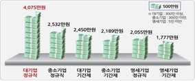 한국경영자총협회가 회원사들에 대학졸업자 정규직 초임을 낮추고 신규채용 확대를 요청했다.2일 경총의 '우리나라 대졸 초임 분석 결과'에 따르면 대졸 신입근로자를 기준으로 지난해 대기업 정규직 초임 평균(임금총액 기준)은 4075만원(고정급 기준 3646만원)으로 추정됐다.반면 중소기업 정규직은 2532만원, 대기업 기간제 2450만원, 중소기업 기간제 2189만원, 영세기업 정규직 2055만원, 영세기업 기간제 1777만원이다.대기업 정규직 대졸 초임을 100%로 봤을 때 중소기업 정규직은 62.1%, 대기업 기간제 60.1%, 중소기업 기간제 53.7%, 영세기업 정규직 50.4%, 영세기업 기간제 43.6% 수준이었다.2014년 한국·일본간 대졸 신입근로자 초임의 절대적 수준 비교했을 때 우리나라 대기업(300인 이상) 정규직 대졸 신입근로자 초임(임금총액 기준)은 3만7756달러로 일본 대기업(1000인 이상) 상용직 대졸 신입근로자 초임(임금총액 기준) 2만7105달러보다 39% 높았다고 경총은 분석했다.2014년 우리나라의 1인당 국내총생산(GDP) 대비 대기업(300인 이상) 정규직 대졸 초임 비율은 135.0%로 일본의 1인당 GDP 대비 대기업(