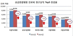 전국 43개 상급종합병원 가운데 지난해 기준 진료비를 가장 많이 청구한 의료기관은 서울아산병원인 것으로 나타났다.이는 2013년에도 마찬가지였다. 지난해 국내 빅5병원의 진료비 청구액은 2조9798억원으로, 전체 청구액(8조6549억원)의 34.8%를 차지했다. 우리나라 환자들의 초대형병원 선호도를 그대로 반영했다.9일 보건의료 분석평가 전문사이트인 팜스코어(www.pharmscore.com)가 전국 43개 상급종합원의 2014년도 진료비 청구실적을 분석한 결과 청구실적 1위는 서울아산병원이었다.아산병원의 지난해 청구액은 2013년 대비 5.2% 증가한 8156억원이었다. 청구액 2위는 삼성서울병원(6343억원·13.0% ↑), 3위는 세브란스병원(5940억원·7.5% ↑), 4위는 서울대병원(5538억원·8.3% ↑), 5위는 서울성모병원(3820억원·4.3% ↑)순으로 나타났다.비 수도권 지역 소재 상급종병 가운데 진료비 청구액이 가장 많은 의료기관은 충남대병원(1924억원·7.0% ↑)이었다.이로써 전체 43개 상급종합병원이 지난해 청구한 전체 진료비 청구액은 전년(8조602억원) 대비 6.3% 늘어난 8조5649억원에 달한다.전년대비 진료비 청구액이