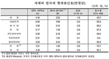 지난 2010년이후 지금까지 우리나라의 출산율이 세계출산율의 절반도 안되는 것으로 나타났다.8일 통계청이 7월11일 인구의 날에 즈음해 발표한 '세계와 한국의 인구현황 및 전망'에 따르면 '2010~2015년 한국의 합계출산율은 1.23명으로 세계의 합계출산율 2.50명에 두배 가량 못미쳤다.'출산율'은 여성 1명이 가임기간(15~49세)동안 낳을 것으로 예상되는 평균 출생아수를 의미한다.우리나라의 합계출산율은 전통적으로 합계출산율이 낮았던 유럽 1.58명, 북아메리카 1.94명보다도 낮았다. 또한 북한(2.00명)보다도 우리보다 0.77명이 많았다.특히 이 기간 우리나라의 합계출산율은 1970~1974년 4.21명에 비해 4배 정도가 적었다.당시 세계합산출산율이 4.44명인 가운데 북아메리카(2.01명), 오세아니아(3.23명), 유럽(2.17명), 북한(4.00명) 등은 우리보다 낮았지만 지금은 우리를 추월했다.통계청 관계자는 "한국의 합계출산율은 1970~1974년 4.21명으로 세계 국가중 73번째로 낮았지만 2010~2015년에는 1.23명으로 세계에서 4번째로 낮은 수준으로 추정된다"고 밝혔다.우리보다 합계출산율이 낮을 것으로 추산되는 국가는 타이