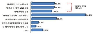 중년 구직자들의 가장 큰 스트레스 원인은 경제적 문제인 것으로 조사됐다. 또 재취업자 절반 가까이가 재취업 사전 준비 없는 상태에서 퇴직했다.전경련중소기업협력센터가 채용 포털 파인드잡과 공동으로 40세 이상 중장년 1032명을 대상으로 벌인 '2015년 중장년의 재취업 인식조사' 결과, 중장년 재취업 스트레스의 원인은 '수입부족'(15.3%)·'대출금 등 채무'(15.2%)·'자녀 교육비'(13.6%) 등 경제적 문제가 44.1%로 가장 많았다.이어 '재취업 가능성에 대한 불안감' 36.2%, 상실·소외감' 16.6%, '갑작스러운 공백 시간의 활용문제' 4.7% 등이 뒤따랐다.중장년들의 재취업 준비는 '하지 않았다'(43.0%)가 '했다'(33.4%)보다 약 10% 포인트 높았다. 절반에 가까운 중장년들이 충분한 준비 없이 돌발퇴직한 것이다.중장년 10명 중 4명은 퇴직 후 1년 이상 무직 상태로 장기 실업상태였다. 1년 이상 장기간 구직활동 중인 중장년들은 37.1%(1~2년 20.2%, 2년 이상 16.9%)에 달했다. '6개월~1년'이 26.6%, '3~6개월'이 18.3%, '3개월 이내'가 18.0%였다.응답한 중장년들의 퇴직 전 업무는 경영·사무