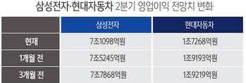 증권사들이 2분기 실적 시즌을 앞두고 국내 증시 대표주들의 실적 전망치를 줄줄이 낮추고 있다. 28일 금융정보제공업체인 와이즈에프엔에 따르면 증권사들이 예상한 삼성전자의 2분기 영업이익 추정치는 7조1098억원이다. 증권사들이 3개월 전에 예상했던 삼성전자의 영업이익 전망치는 7조7868억원, 1개월 전 전망치는 7조5245억원이었다. 실적 발표일이 다가올수록 전망치가 낮아지고 있는 셈이다.1분기 실적 발표 직후에는 2분기 삼성전자 영업이익이 8조 원에 이를 것이라는 전망이 대다수였던 것에 비해면 1조원 가까이 줄어든 것이다. '갤럭시S6'와 '갤럭시S6엣지' 등 신규 스마트폰 판매량이 기대치에 미치지 못할 것으로 전망된 것이 영업이익 전망치를 낮추는 결정적인 원인으로 작용했다. 특히 글로벌 시장에서 애플의 경쟁력이 확대되는 반면 삼성전자의 중저가 라인 판매가 부진한 것이 삼성전자의 전반적인 실적전망을 어둡게 만들고 있다.교보증권 최도연 연구원은 "갤럭시S6 출하량에 대한 시장 전망치가 다소 높았던 영향으로 스마트폰 담당인 IM 사업부 이익이 기존 기대치를 소폭 하회할 전망"이라며 "삼성전자의 2분기 영업이익은 7조원 정도로 예상된다"고 밝혔다.NH투자증권