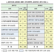 [파이낸셜데일리=송지수 기자]세계경제포럼(WEF)이 매년 발표하는 국가경쟁력 평가에서 지난해 74위에 그쳤던 우리나라의 금융부문 경쟁력 순위가 올해 19위로 껑충 뛰어올랐다. 이에 따라 우간다보다도 금융 경쟁력이 낮다던 오명도 벗게 됐다. 17일 WEF가 발표한 국가경쟁력 평가 결과에 따르면 평가대상 140개국 가운데 우리나라는 종합순위 15위를 기록했으며 금융시스템 경쟁력은 19위를 차지했다. 지난해와 비교해 종합순위가 11계단 상승한 가운데 금융부문의 경우 55계단이나 뛰어올라 약진이 두드러졌다. WEF의 국가경쟁력 금융부문 평가에서 우리나라는 줄곧 박한 평가를 받아왔다. 2013년 이후 종합순위는 20위권을 유지한 데 반해 금융부문 순위는 ▲2013년 81위 ▲2014년 80위 ▲2015년 87위 ▲2016년 80위 ▲2017년 74위 등에 그쳤다. 우리보다 한참 아래로 여겼던 아프리카 우간다와 비슷하거나 오히려 낮은 수준이었다. 국내 금융경쟁력을 말할 때 우간다와의 비교가 꼬리표처럼 따라붙게 된 것도 이 때문이다. 올해 금융시스템 평가 1위는 미국이 차지했으며 홍콩이 뒤를 이었다. 3~5위는 핀란드, 스위스, 싱가포르가 각각 차지했다. 우간다의 올해