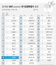 [파이낸셜데일리=김유미 기자]세계경제포럼(WEF)이 매년 발표하는 국가경쟁력 평가에서 한국이 주요 선진국 수준의 평가를 받았다. 그러나 지난해에 이어 올해도 생산물 및 노동시장은 국가경쟁력을 취약하게 하는 요인으로 지적됐다. WEF는 올해 140개국을 대상으로 국가경쟁력을 평가한 결과, 한국이 종합순위 15위를 차지했다고 17일 밝혔다. 아시아 국가 중에선 5위이며 경제협력개발기구(OECD) 35개국 중에선 12위다. 미국(1위), 싱가포르(2위), 독일(3위), 스위스(4위), 일본(5위), 홍콩(7위), 영국(8위), 대만(13위)보다는 낮고, 프랑스(17위), 중국(28위)보다는 높다. 올해부터 평가 방식이 개편되면서 종합순위가 상향 조정됐다. 구지수를 기준으로 하면 우리나라는 지난해까지 4년 연속 26위를 기록했으나 신지수로 보면 지난해엔 17위에 올랐고 올해 2계단 상승했다. WEF는 올해부터 4차 산업혁명, 글로벌 금융위기 경험 등 경제 환경 여건 변화를 반영해 평가 방식이 개편됐다고 설명했다. 결핵 발병률, 말라리아 발병률, 테러 위협 비용, 경영대학원의 질 등 시의성·객관성이 떨어지는 항목이 삭제되고 광케이블 인터넷 가입자 수, 특허출원, 시