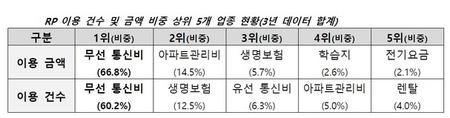 [파이낸셜데일리=송지수 기자] 최근 3년 자동이체 서비스 최다이용은 '무선통신비'로 집계됐다. 아파트관리비 자동이체 이용은 200%넘게 급성장 중이다. 6일 BC카드 빅데이터팀이 자사 카드로 자동이체(RP)를 신청한 고객 450만명의 2015년 9월부터 지난달까지 이용패턴을 분석한 결과 이용 금액의 66.8%가 무선통신비로 나타났다. 이용금액 기준 2위인 아파트관리비(14.5%)와 압도적으로 차이나는 수치다. 3위는 생명보험(5.7%), 4위 학습지(2.6%), 5위 전기요금(2.1%) 순이다. 카드로 RP를 신청하는 고객들이 매년 증가하고 있다. 3년 동안 RP를 이용한 고객은 연평균 17.5% 늘었다. 연평균 이용금액과 이용건수도 각각 24.6%, 17.4% 증가했다. 아파트 관리비를 RP하는 고객은 최근 급격히 증가하고 있다. 아파트 관리비의 경우 RP를 이용한 금액 및 건수가 최근 3년 연평균 218.6%, 237.7% 증가했다. 4대보험과 도시가스, 전기요금 업종도 매년 큰 폭 증가세를 보이고 있다. 김진철 BC카드 마케팅부문장은 "정기적으로 발생되는 지출에 대해 카드로 편리하게 자동 납부할 수 있는 업종이 다양해지고 있다"며 "RP를 신청하는 고객
