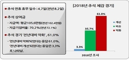 [파이낸셜데일리=강철규 기자]올해 추석 상여금을 지급할 계획이 있는 기업은 지난해보다 감소한 70.2%인 것으로 나타났다. 기업들의 평균 추석 휴무일수는 평균 4.7일로 지난해보다 3.5일 감소했다. 한국경영자총협회(경총)은 이 같은 내용을 담은 '2018년도 추석연휴 및 상여금 실태조사' 결과를 9일 발표했다. 이번 조사는 전국 5인 이상 527개 기업을 대상으로 진행됐다. 조사결과 추석상여금 지급 계획이 있는 기업은 지난해 72.1%보다 1.9%포인트 감소한 70.2%인 것으로 나타났다. 기업규모별로는 300인 이상 기업이 지난해보다 4.1% 포인트 줄어든 73.2%, 300인 미만 기업이 2.5%포인트 줄어든 69.4%였다. 평균 상여금은 105만6000원으로 지난해 102만4000원보다 3만2000원 증가했다. 기업규모별로는 300인 이상 기업이 154만2000원으로 지난해(147만5000원)보다 6만7000원 늘었고, 300인 미만 기업은 93만1000원으로 지난해(91만2000원)보다 1만9000원 증가했다. 기업들의 추석연휴 평균 휴무일수는 지난해보다 3.5일 감소한 4.7일이었다. 300인이상 기업 4.9일, 300인 미만 기업이 4.7일