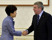 박근혜 대통령은 21일 오후 청와대에서 토마스 바흐(Thomas Bach) 국제올림픽위원회(IOC) 위원장을 접견했다.이날 접견은 바흐 위원장의 '2018 평창동계올림픽' 개최국 원수에 대한 예방 차원에서 마련됐으며 동계올림픽의 성공적인 개최를 위한 협력 방안과 IOC와의 인적 교류 활성화 등이 논의됐다.1976년 몬트리올 올림픽 펜싱 플뢰레에서 금메달을 딴 바 있는 바흐 위원장은 지난 9월10일 제125차 IOC 총회에서 제9대 위원장으로 선출됐다. 올림픽 금메달리스트 출신으로는 첫 IOC 위원장이다.바흐 위원장의 방한은 1999년 6월 IOC 서울 총회, 2006년 4월 국가올림픽위원회 총연합회(ANOC) 서울 총회, 2011년 8월 대구세계육상선수권대회 등에 이어 이번이 네 번째다. 2000년 시드니올림픽 남북 공동입장에 대해 "가장 감동적인 순간의 하나로 기억한다"고 말하는 등 한국과의 인연이 깊은 것으로 알려졌다.박 대통령은 이날 바흐 위원장을 만난 자리에서 "IOC 역사가 120년 가까이 되는데 처음으로 올림픽 금메달리스트 출신이 위원장을 맡게 돼 스포츠계와 국제사회의 기대가 크다"고 말했다.또 "1976년에 (위원장이) 금메달을 몬트리올 올림픽에