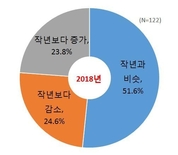 [파이낸셜데일리=강철규 기자]올해 대기업 신규채용은 작년과 비슷한 규모로 치뤄질 전망이다. 전국경제인연합회 산하 한국경제연구원(한경연)은 여론조사기관 리서치앤리서치에 의뢰해 '2018년 주요 대기업 대졸 신규채용 계획'을 조사해 발표했다. 한경연에 따르면, 올해 신규채용 규모는 '작년과 비슷'(51.6%), '작년보다 감소'(24.6%), '작년보다 증가'(23.8%) 순으로 나타나 신규채용은 전반적으로 지난해와 비슷한 수준으로 보인다. 신규채용을 늘린다고 응답한 기업들은 그 이유로 '근로시간 단축으로 부족한 인력의 충원'(37.9%), '회사가 속한 업종의 경기상황 개선'(31.0%), '미래 인재확보 차원'(24.1%), '사회적 기대에 부응'(6.9%) 등을 꼽았다. 신규채용을 줄인다고 응답한 기업들은 그 이유로 '국내외 경제 및 업종 경기상황 악화'(40.0%), '회사 내부 상황 어려움'(33.3%), '최저임금 인상 등 인건비 부담 증가'(16.7%), '비정규직의 정규직 전환으로 인해 신규채용 여력 감소'(3.3%) 등을 꼽았다. 올해 대졸 신입직원 채용은 '작년과 비슷'(57.4%), '작년보다 감소'(23.8%), '작년보다 증가'(