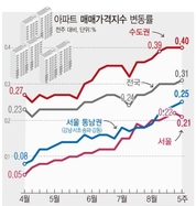[파이낸셜데일리 강철규 기자] 사전청약 확대, 가계대출 제한, 기준금리 인상, 신규택지 발표 등 주택시장 과열을 잡기 위해 정부가 온갖 대책을 내놓고 있지만 아파트값은 이를 비웃듯 오히려 상승 폭을 키우고 있다. 2일 한국부동산원에 따르면 8월 다섯째 주(지난달 30일 기준) 수도권 아파트값은 일주일 전보다 0.40% 상승했다. 지난 7월 중순부터 7주째(0.32→0.36→0.36→0.37→0.39→0.40→0.40→0.40%) 최고 상승률 기록을 경신하고 있다. 전국 아파트값도 0.31%로 일주일 전(0.30%)보다 0.01%포인트(p) 확대됐고, 지방 아파트값도 0.22%로 일주일 전(0.19%)보다 0.3%p 커졌다. 정부는 최근 한 달 사이 급등하는 집값을 잡기 위해 각종 대책을 쏟아내고 있다. 지난달 25일 사전청약을 민간분양으로 확대해 10만가구를 추가하는 방안을 발표한 데 이어 지난달 30일에는 의왕·군포·안산, 화성 진안 등 수도권에 신도시를 조성하는 내용의 3차 신규 공공택지 입지를 발표했다. 이에 앞서 지난 26일에는 한국은행이 15개월 만에 기준금리를 0.50%에서 0.75%로 인상했고, 이와 함께 금융당국은 강력한 가계대출 조이기에 나선