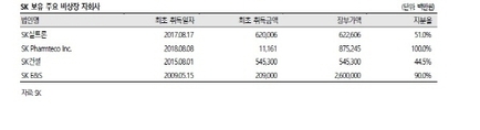 [파이낸셜데일리=송지수 기자] SK증권은 3일 SK(034730)에 대해 SK바이오팜의 성공적인 IPO(기업공개)로 실적 부진 부담을 덜고 SK실트론·SK팜테코의 가치도 재평가될 것으로 기대했다. 목표주가는 39만원, 투자의견은 매수를 유지했다. 최관순 SK증권 연구원은 "SK이노베이션의 2분기 업황 부진에 영업이익이 적자전환한 이유로 SK의 연결 실적도 부진할 것으로 예상된다"며 "다만 전날 상장한 SK바이오팜이 12만7000원으로 마감하면서 SK가 보유한 바이오팜 가치는 7조4593억원에 달한다"고 말했다. 전날 SK바이오팜은 시초가 200%에서 시작해 상한가로 장을 마감했다. SK는 SK바이오팜 지분을 75% 보유하고 있다. 최 연구원은 "SK바이오팜의 성공적인 기업공개로 SK바이오팜 가치가 현실화했으며 SK실트론과 SK팜테코 등 비상장 자회사의 가치도 재평가될 것"이라며 "SK바이오팜 주가가 추가 상승한다면 SK의 지분가치도 추가 상승해 밸류에이션 부담도 완화할 것 같다"고 전망했다.