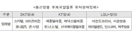 [파이낸셜데일리=강철규 기자] 과학기술정보통신부 우정사업본부(이하 우본)이 우체국알뜰폰 위탁판매업체로 13개 사를 선정했다. 15일 우본에 따르면 이번에 선정된 업체는 ▲머천드코리아 ▲서경방송 ▲세종텔레콤 ▲스마텔 ▲아이즈비전 ▲에넥스텔레콤 ▲와이엘랜드 ▲위너스텔 ▲유니컴즈 ▲인스코비 ▲제주방송 ▲큰사람 ▲한국케이블텔레콤이다. ▲세종텔레콤 ▲스마텔 ▲에넥스텔레콤 ▲한국케이블텔레콤 등 4개 업체는 신규로 선정된 것이다. 통신망별로는 SKT망 4개 업체, KT망 4개 업체, LGU+망 5개 업체다. 선정된 13개 업체는 10월 말까지 우본과 계약한 뒤 내년 1월1일부터 서비스를 시작, 2021년까지 3년 간 서비스를 제공한다. 우본은 "이번에 위탁판매업체로 선정됐음에도 추가 현장 방문 등에서 허위사실 등이 발견된 때에는 계약이 체결되지 않거나 취소될 수 있다"고 밝혔다.