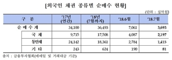 [파이낸셜데일리=송지수 기자]한-미 금리 역전 차 심화로 외국인의 국내 채권 순매수세가 둔화한 것으로 나타났다. 7일 금융투자협회에 따르면 지난달 말 기준 외국인의 국내 채권 보유 잔고는 112조435억원으로 전월(110조5620억원) 대비 1조5000억원 증가해 6월에 이어 사상 최고치를 재차 경신했다. 다만 순매수 규모는 7조8000억원에서 3조2000억원으로 반 이상 줄었다. 외국인은 국채를 2조1970억원어치, 통안채를 1조4150억원어치 사들였으며 채권 거래량은 11조9010억원 규모로 전월 대비 1조5060억원 줄었다. 협회 관계자는 "원화 약세에도 불구하고 무역 분쟁에 따른 안전자산 선호와 외환 스와프 포인트 마이너스로 재정 거래가 지속했으나 한-미 금리 역전 폭 확대로 매수 규모가 둔화했다"고 설명했다. 한-미 국채 10년물 금리 차이는 지난해 12월29일 기준 6.0bp에서 지난달 31일 기준 39.5bp로 크게 증가했다. 영업일 수 증가 및 금리 등락에 따른 거래 증가로 지난달 장외 채권거래량은 전월 대비 21조9810억원 증가한 437조1000억원으로 집계됐다. 일평균 거래량은 전월 대비 2조원 줄어든 19조8680억원을 기록했다. 금융채