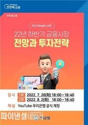 [파이낸셜데일리 서현정 기자] 우리은행이 오는 26일과 8월 2일 두 차례에 걸쳐 유튜브 언택트 세미나 '우리 Wealth LIVE'를 개최한다. 21일 우리은행에 따르면 오는 26일 오후 6시 진행되는 1부에서는 '경기침체 위기와 채권시장'을 다룬다. 김동환 우리자산운용 부장이 출연해 최근 시장의 핵심 이슈인 인플레이션과 중앙은행의 금리 인상 전망을 바탕으로 채권투자 전략을 제시한다. 2부는 8월 2일 오후 6시 '변동성 확대와 주식시장'이라는 주제로 진행된다. 김지영 베어링자산운용 본부장이 경기침체 위기와 우려감으로 변동성이 크게 확대된 주식시장 전반을 점검하고 하반기 투자전략과 리스크 요인을 알기 쉽게 설명할 예정이다. 우리은행 관계자는 "최신 금융 이슈를 전문가와 함께 분석해 볼 수 있는 라이브 방송"이라며 "앞으로도 다양한 금융서비스와 정보를 제공하는 세미나를 정기적으로 개최할 것"이라고 말했다. 세미나에 참여하고 싶은 고객은 1부의 경우 7월 25일까지, 2부는 8월 1일까지 모바일 앱 우리WON뱅킹의 '혜택/이벤트'에서 등록 신청 하면 된다.