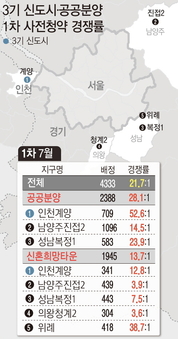 [파이낸셜데일리 강철규 기자] 공공분양주택 1차 사전청약 접수결과 4333가구 모집에 9만3798명이 신청해 21.7대 1의 경쟁률을 기록했다. 3기 신도시인 인천계양의 경우 709가구(공공분양) 모집에 3만7000명이 몰리면서 52.6대 1의 경쟁률을 보였다. 국토교통부는 올해 첫 사전청약 공급지구인 인천계양, 남양주진접2, 성남복정1 등 4333가구 공급에 대한 청약 신청을 마감한 결과 9만3798명이 신청했다고 12일 밝혔다. 사전청약은 공공택지 등에서 공급되는 공공분양주택을 본청약 1~2년 전에 미리 청약하는 제도다. 이번 1차 사전청약은 공공분양주택과 신혼희망타운으로 나눠 접수됐다. 접수결과 공공분양주택 28.1대1(특별공급 15.7대1·일반공급 88.3대1), 신혼희망타운 13.7대1 등의 경쟁률을 기록했다. 3기 신도시 인천계양 52.6대 1…가장 인기 끌어 3기 신도시 중 처음으로 사전청약에 나선 인천계양의 경우 709가구(공공분양) 공급에 3만7255명이 몰리면서 52.6대 1의 경쟁률을 보였다. 특히 이른바 '국민평형'으로 불리는 84㎡는 28가구 모집에 1만670명이 신청하면서 무려 381.1대 1의 경쟁률을 기록했다. 인천계양 신혼희망타