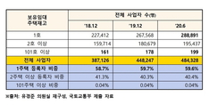 [파이낸셜데일리 강철규 기자] 주택임대사업자 약 60%가 주택 한 채만 등록한 것으로 나타났다. 12일 국민의힘 부동산공시가격검증센터 센터장인 유경준 의원이 국토교통부로부터 제출받은 '보유임대주택수 별 전체 임대사업자 현황 자료'를 분석한 결과 지난해 전체 임대사업자 48만4000명 중 28만9000명(59.6%)이 1주택만 등록한 것으로 나타났다. 19만5437명(40.4%)은 2주택 이상을 등록했으며, 주택을 100채 이상 등록한 사업자는 199명(0.04%)으로 집계됐다. 유경준 의원은 "'수 십 채의 부동산을 가진 등록임대사업자가 부동산을 팔지 않아 집값이 상승했다'는 정부와 여당의 주장은 사실이 아닌 것으로 밝혀졌다"고 말했다. 그러면서 "대다수 등록임대사업자는 지난 2017년 문재인 정부의 임대사업자 등록 장려제도를 믿고 자신이 가지고 있던 단 한 채의 주택을 임대 등록한 생계형 임대사업자지만 정작 문재인 정부와 여당은 임대사업자 다수가 수백 채의 주택을 가지고 있는 사람인 것처럼 과장하며 자신들의 부동산정책 실패 책임을 임대사업자에게 떠넘기기고 있다"고 지적했다. 정부와 여당은 지난 10일 폐지를 예고했던 민간 임대사업자 세제 혜택을 현행대로 유