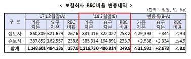 [파이낸셜데일리=송지수 기자]보험회사의 지급여력비율을 나타내는 RBC비율이 소폭 하락했다. 다만 기준선은 크게 웃돌고 있어 재무건전성은 양호한 상태를 보였다. 24일 금융감독원에 따르면 3월 말 RBC비율은 249.9%로 전분기인 지난해말(257.9%) 대비 8.0%p 하락했다. 생보사는 9.4%p 하락한 258.2%, 손보사는 4.9%p 낮아진 233.7%를 기록했다. RBC비율은 요구자본에 대한 가용자본 비율을 나타내는 지표다. 보험회사가 예상하지 못한 손실발생시에도 보험계약자에 대한 보험금 지급의무를 이행할 수 있도록 책임준비금 외에 추가로 순자산을 보유하도록 하는 제도다. 보험업법에서는 이를 100% 이상 유지하도록 규정한다. 가용자본이란 보험사의 각종리스크로 인한 손실금액을 보전할 수 있는 자본량을 의미한다. 요구자본은 보험사의 내재된 각종 리스크가 현실화한 경우의 손실금액이다. 지난해 말 가용자본은 3조2000억원 줄었다. 금리상승에 따라 매도가능증권평가이익이 4조4000억원 감소한 탓이다. 요구자본은 3000억원 늘었다. 금리상승으로 금리위험액이 2000억원 감소했지만 신용위험액이 4000억원 늘었다. 금감원 관계자는 "지난해 말 RBC비율이 보