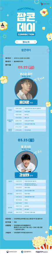 [파이낸셜데이릴 강철규 기자] 오는 22일, 23일에 걸쳐 틈 문화창작지대에서 열리는 팝콘데이는 멘토스피치, 창작자 네트워킹, 팝 콘서트, 데모데이 등 창작자들 간 자유로운 소통과 융합 창작 활동으로 구성된다. 인천콘텐츠코리아랩 창작프로그램 수료자 및 예비, 초기 창업자들은 물론 콘텐츠 창작에 관심 있는 이들이라면 누구나 무료로 참여할 수 있다. 감미로운 목소리의 아티스트 홍대광은 ‘슈퍼스타K 4’에 출연해 4위를 기록했으며 최근 다섯 번째 미니 앨범 ‘Inside Wants’를 발매했다. 타이틀곡인 ‘내가 나빠’를 비롯해 고백송 ‘Calling U’, ‘방황’, ‘ Rain’, ‘바람과 언덕’, 실제로 결혼식에서 축가로 불렀던 곡을 편곡한 ‘친구가 축가를 부탁했다’ 등 총 6곡이 수록되어 있다. 공부멘토 강성태는 전교 꼴찌에서 수능 상위 0.18%의 성적을 기록하며 서울대학교 합격 신화를 썼고 ‘공부의신’을 설립해 수험생들을 위한 다양한 공부 방법 및 입시 꿀팁을 전해주는 멘토 활동을 해 오고 있다. 홍대광이 출연하는 팝 공연은 22일 오후 7시부터 열리며, 강성태의 팝 콘서트는 23일 오후 7시부터 진행된다. 향기로운 봄의 저녁을 더욱 아름답게 만들어줄