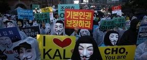 [파이낸셜데일리=강철규 기자]조양호 한진그룹 회장 일가에 맞선 대한항공 전·현직 직원들의 조직적 저항 움직임이 장기화될 전망이다. 이들은 자발적으로 거리에 촛불을 들고 나선 데 이어 체계적인 활동을 위해 직원연대 조직도 구성할 예정이다. 16일 대한항공 직원연대에 따르면 오는 18일 오후 7시30분 서울 광화문 세종문화회관에서는 '조양호 일가 및 경영진 퇴진 갑질 근절 3차 촛불집회'가 열린다. 이번 집회도 지난 1, 2차 집회와 마찬가지로 직원들의 자발적인 참여로 이뤄질 예정이다. 이번에도 직원들은 신분을 숨기기 위해 '가이포크스 마스크(벤데타 가면)'이나 마스크, 모자 등을 착용하고 집회에 나설 계획이다. 지난 4일 처음으로 열린 조 회장 일가의 퇴진과 갑질 근절을 외치는 촛불집회는 매주 열리고 있다. 지난 12일 열린 2차 집회는 주말에 열린 데다 비가 오는 궂은 날씨였음에도 350여명의 참석자가 모였다. 집회가 거듭될수록 대한항공 전·현직 직원뿐 아니라 진에어나 한국공항 등 계열사 직원, 인하대학교 학생 및 직원까지 뜻을 모으고 있다. 이번에도 직원들은 채팅방을 통해 "가족과 함께 참석하겠다" "이번에는 1000명이 넘었으면 좋겠다"면서 참석의