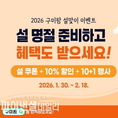 [파이낸셜데일리 박미화 기자] 구미시가 운영하는 농특산물 온라인쇼핑몰 구미팜이 설명절을 맞아 소비자를 위한 설맞이 특별 할인 행사를 1월 30일부터 2월 18일까지 진행한다고 밝혔다. 이번 행사는 설명절을 앞두고 지역 농가의 판로를 확대하고, 소비자에게는 합리적인 가격으로 구미에서 생산된 우수 농특산물을 제공하기 위해 마련됐다. 행사 기간 동안 구미팜 구매고객을 대상으로 구매금액별 즉시 사용 가능한 할인 쿠폰이 제공된다. 쿠폰 혜택은 ▲1만원 이상 구매시 2천원 ▲3만원 이상 구매시 5천원 ▲ 10만원 이상 구매시 1만원 할인으로 결제 단계에서 바로 적용할 수 있다. 구미팜 모바일앱을 신규 설치한 고객에게는 3천원 할인쿠폰을 추가로 제공해, 모바일 이용 활성화와 함께 보다 편리한 쇼핑 환경을 지원한다. 이와 함께 일부 품목을 대상으로 10+1 증정행사와 10% 할인 행사도 진행해, 설 선물용 농특산물을 더욱 알뜰하게 구매할 수 있다. 구미팜은 현재 관내 100여 농가가 참여해 신선 농산물은 물론 장류, 곶감, 한과, 꿀 등 설 명절 선물로 적합한 다양한 품목이 입점해 있으며, 온라인 쇼핑몰(https//:gmmall.cyso.co.kr) 및 모바일 앱을 통해